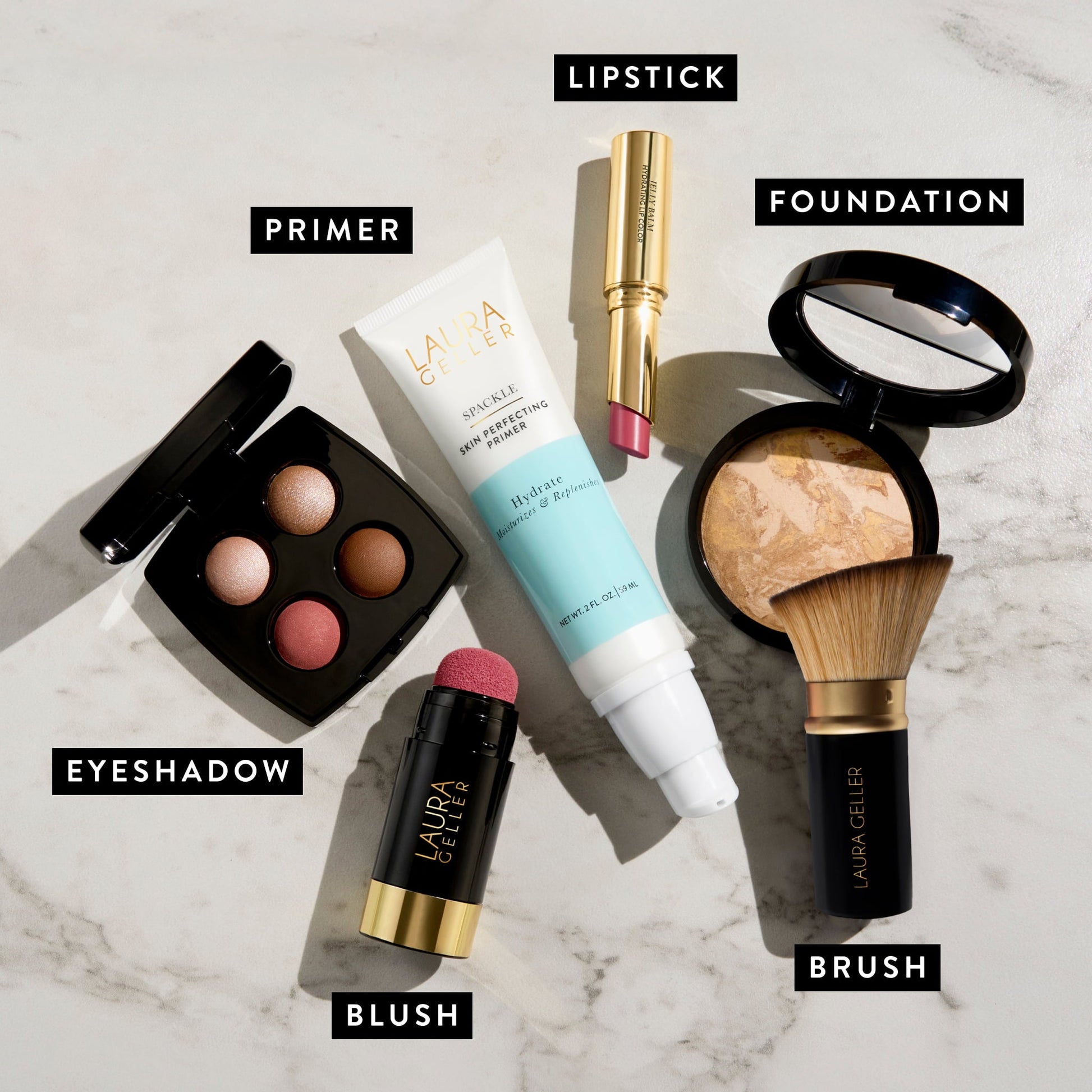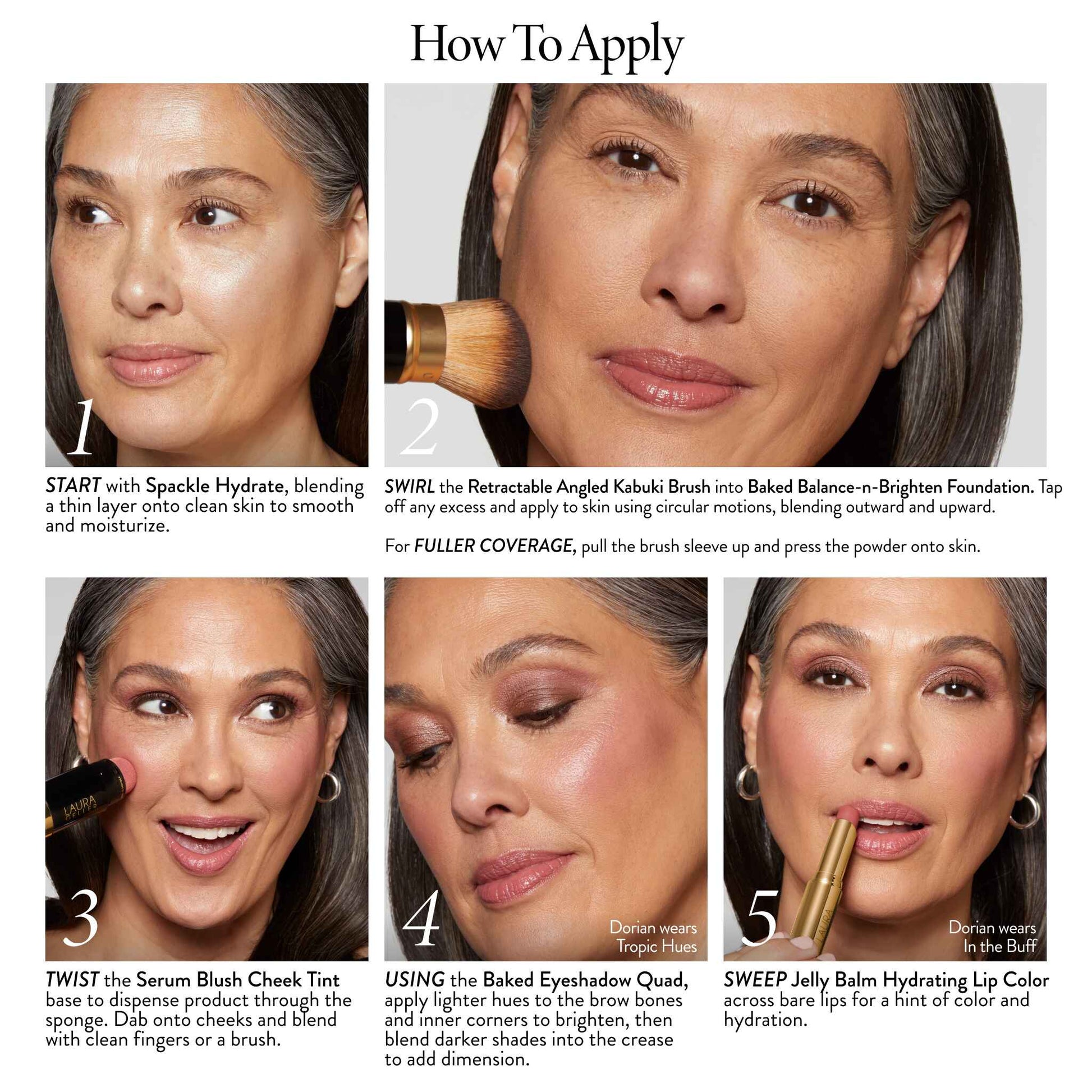 This 6-piece kit includes Baked Balance-n-Brighten Color Correcting Foundation, Spackle Skin Perfecting Primer: Hydrate, Serum Blush Cheek Tint in Practical Pink, Jelly Balm Hydrating Lip Color in the shade In the Buff, Baked Eyeshadow Quad, and our Retractable Angled Kabuki Brush.